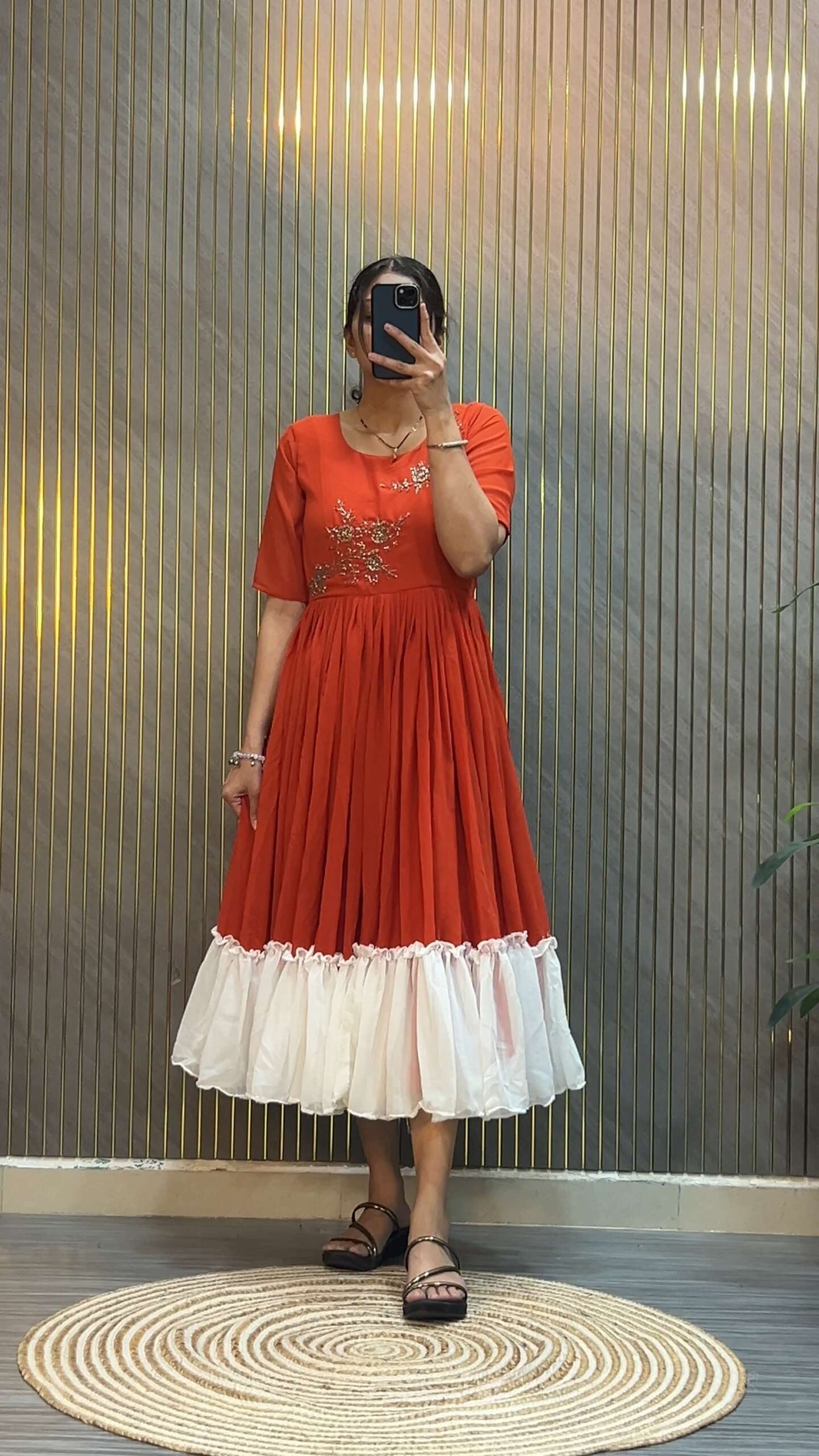 Gown length: 46 inches Gown flair: 3.5mtrs Complete crape linning, attached