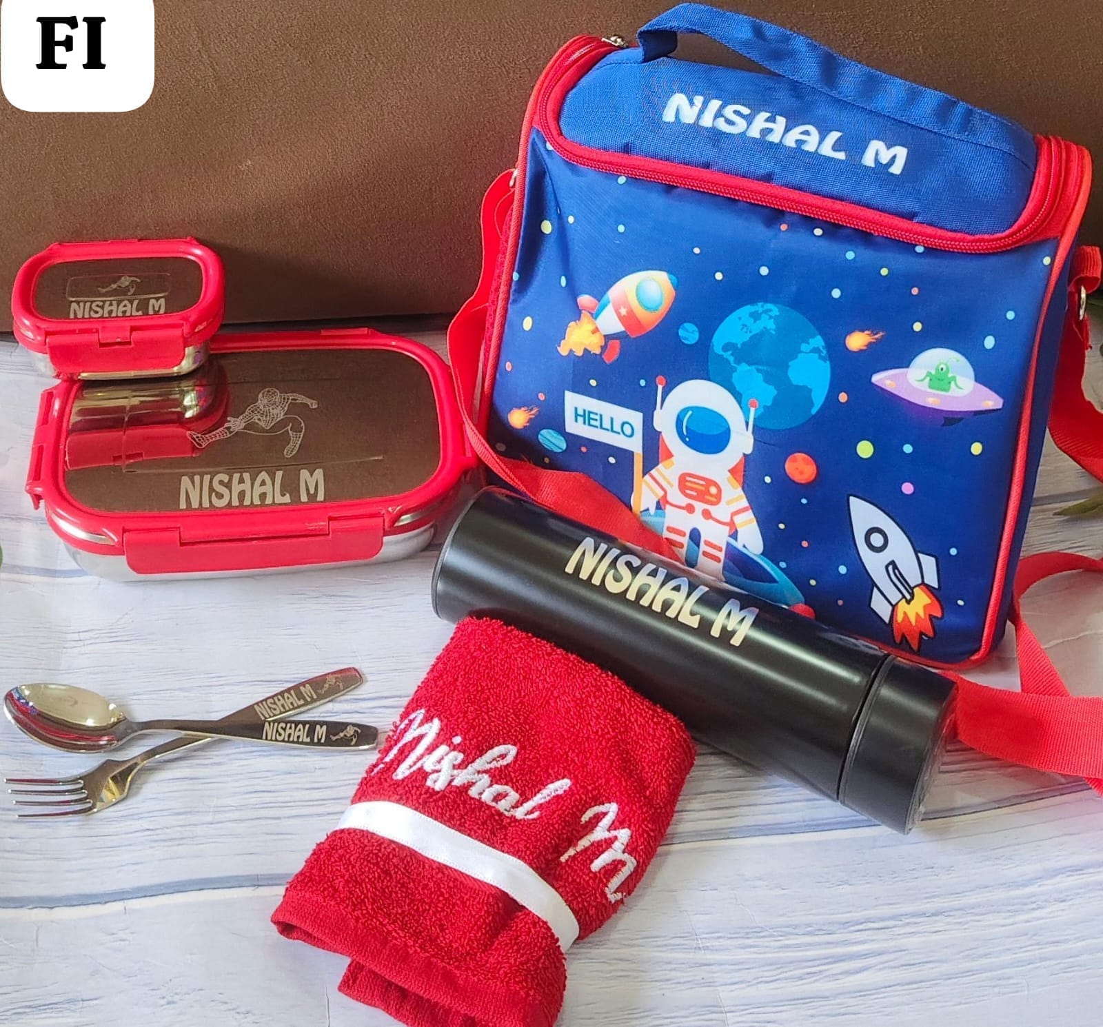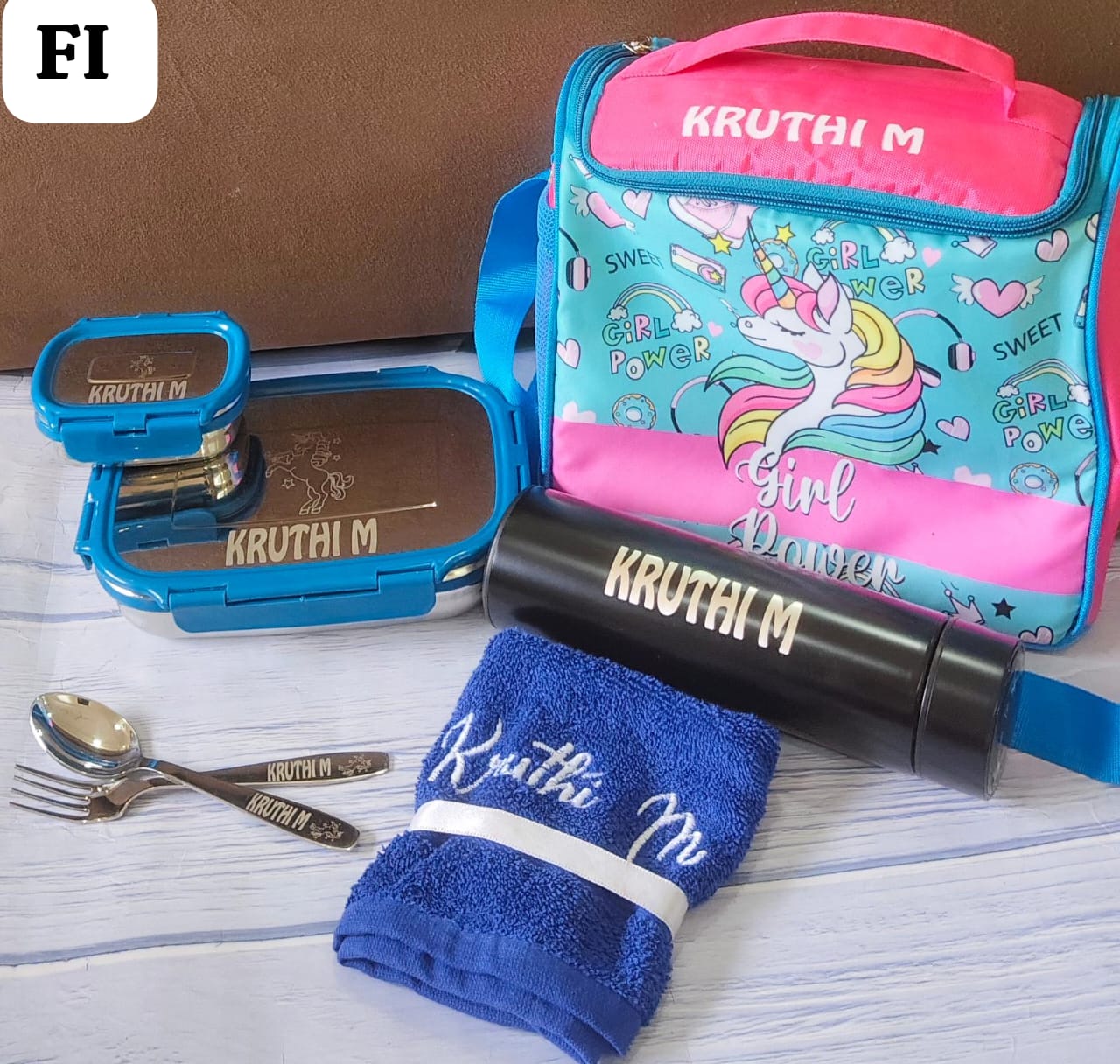 Customised lunch box with customised bottle, spoon, fork, water bottle and lunch bag