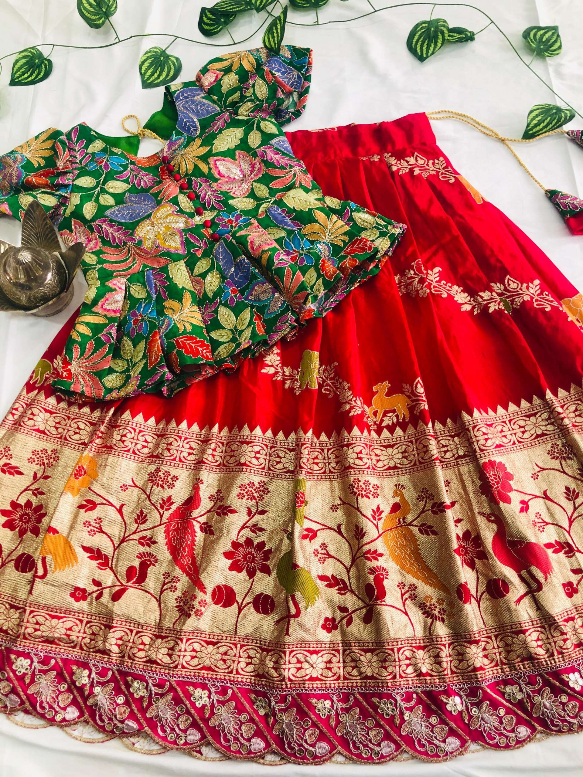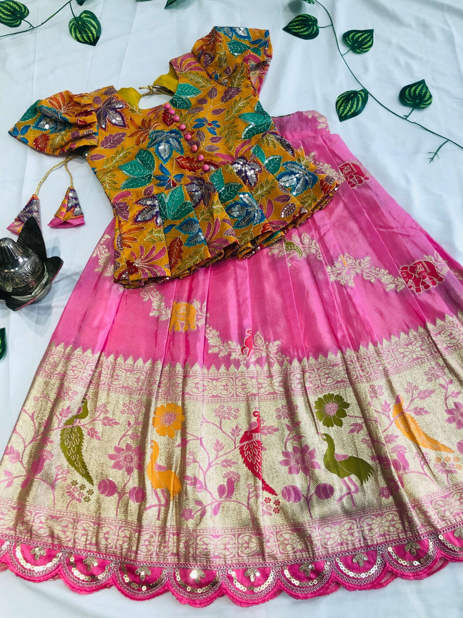 Lehenga – Heavy pure dola silk with print and weaving pattu border lehenga attached border belt and unique tassels