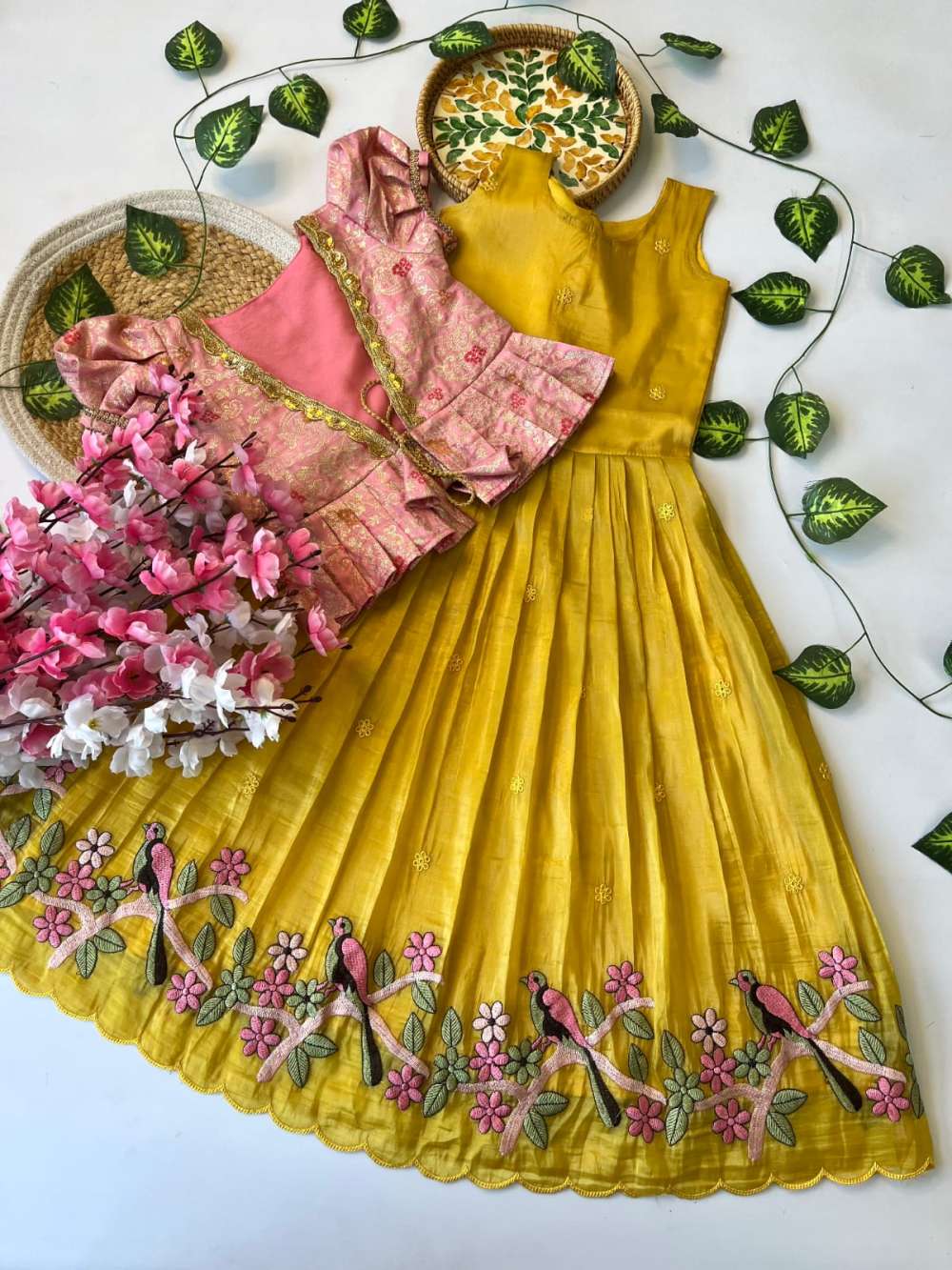 >Gown :- Gold crush fabric with bird embroidery work and Scalloped border