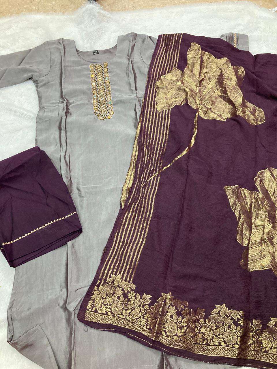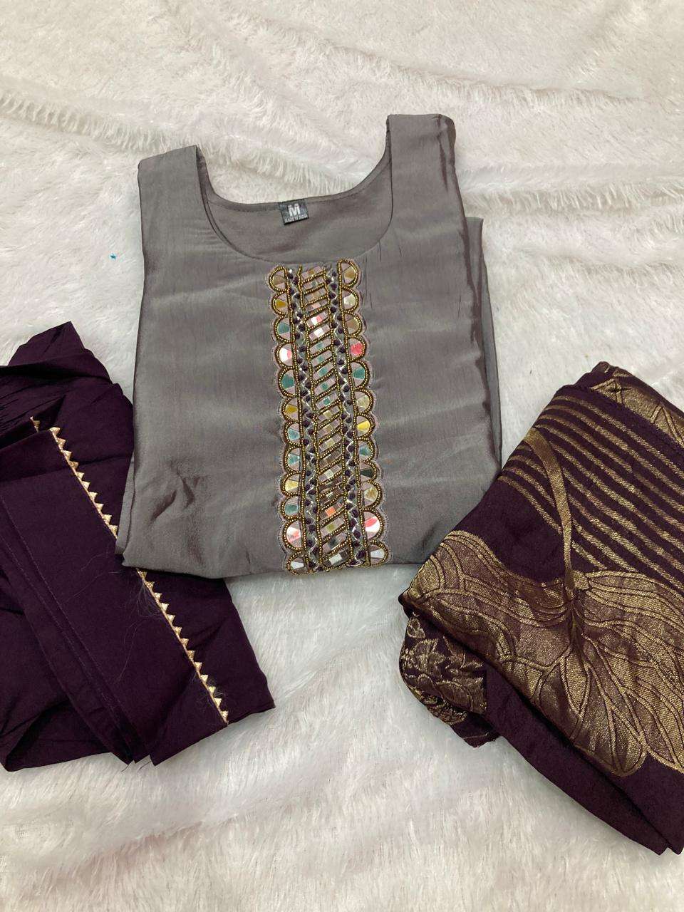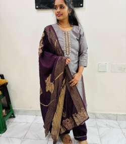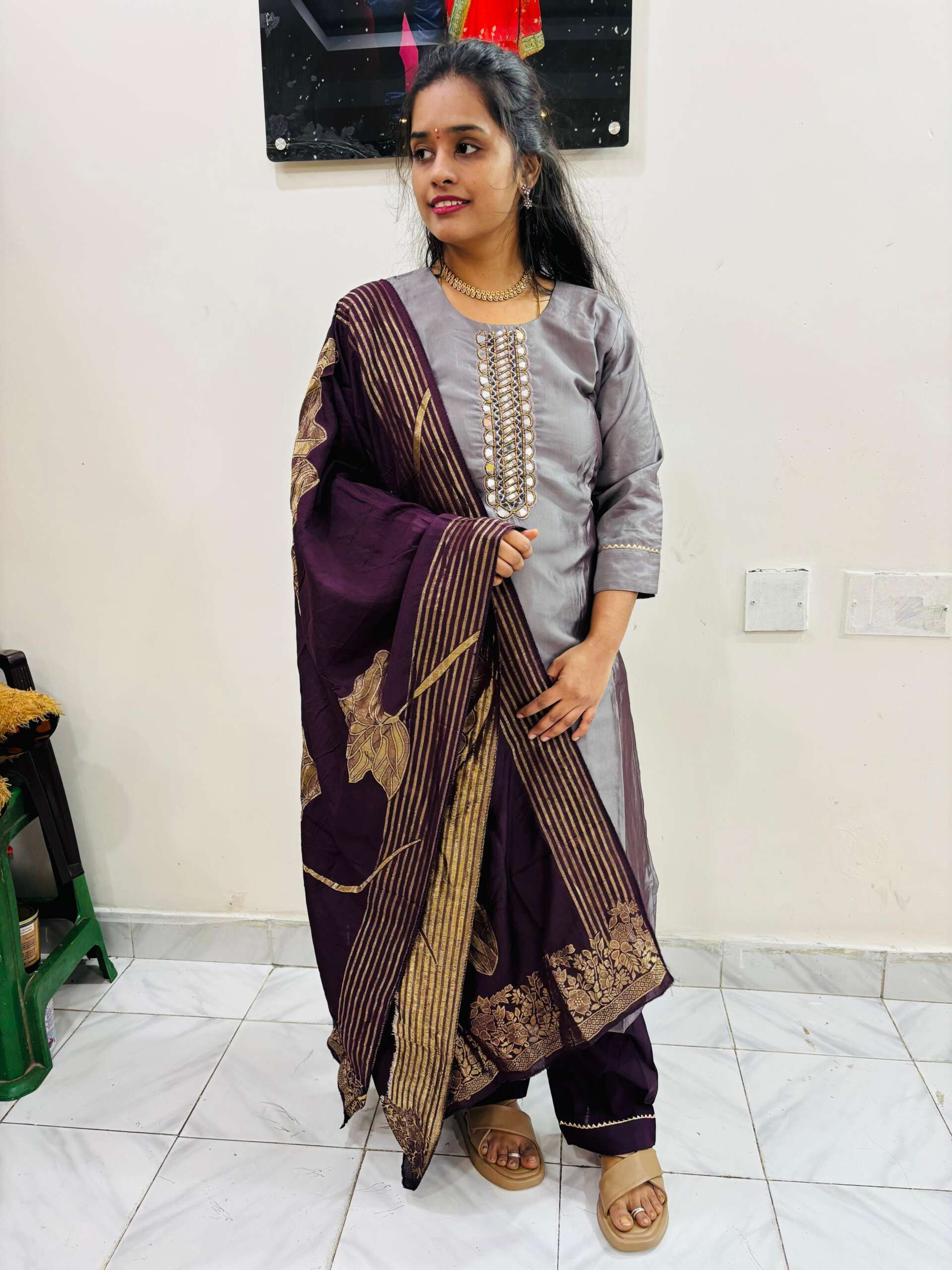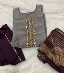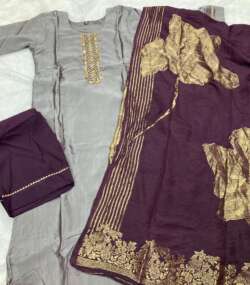 >Gown :- Gold crush fabric with bird embroidery work and Scalloped border>Coat :- Soft Satin dola silk