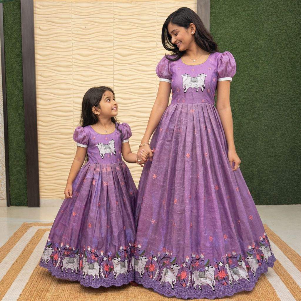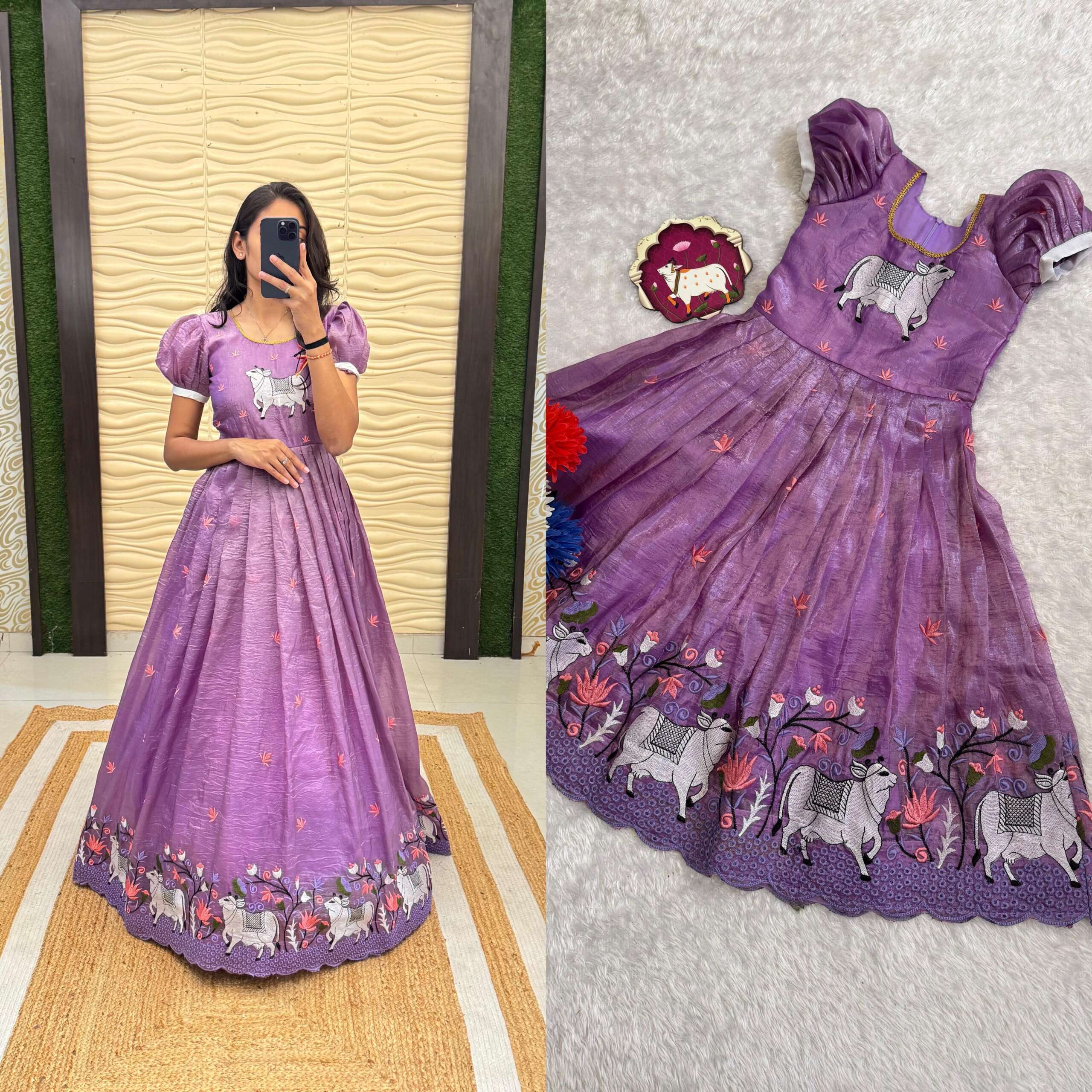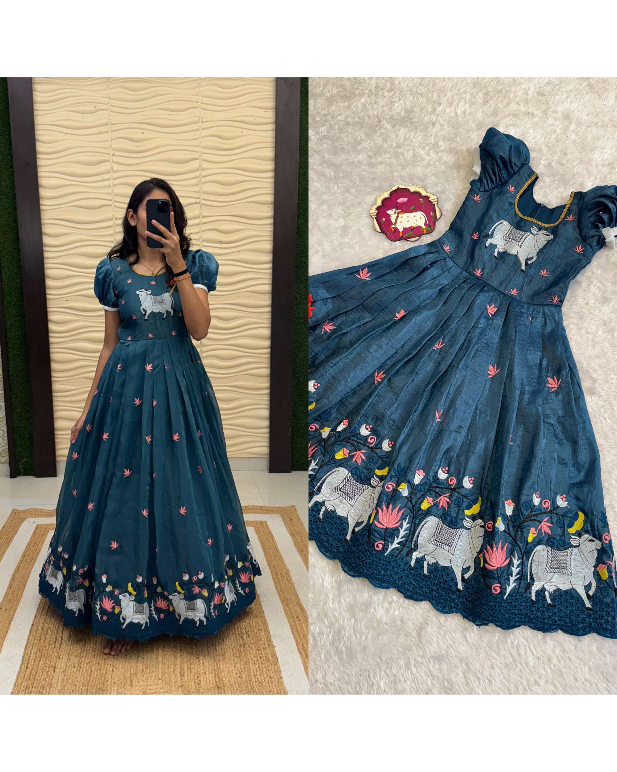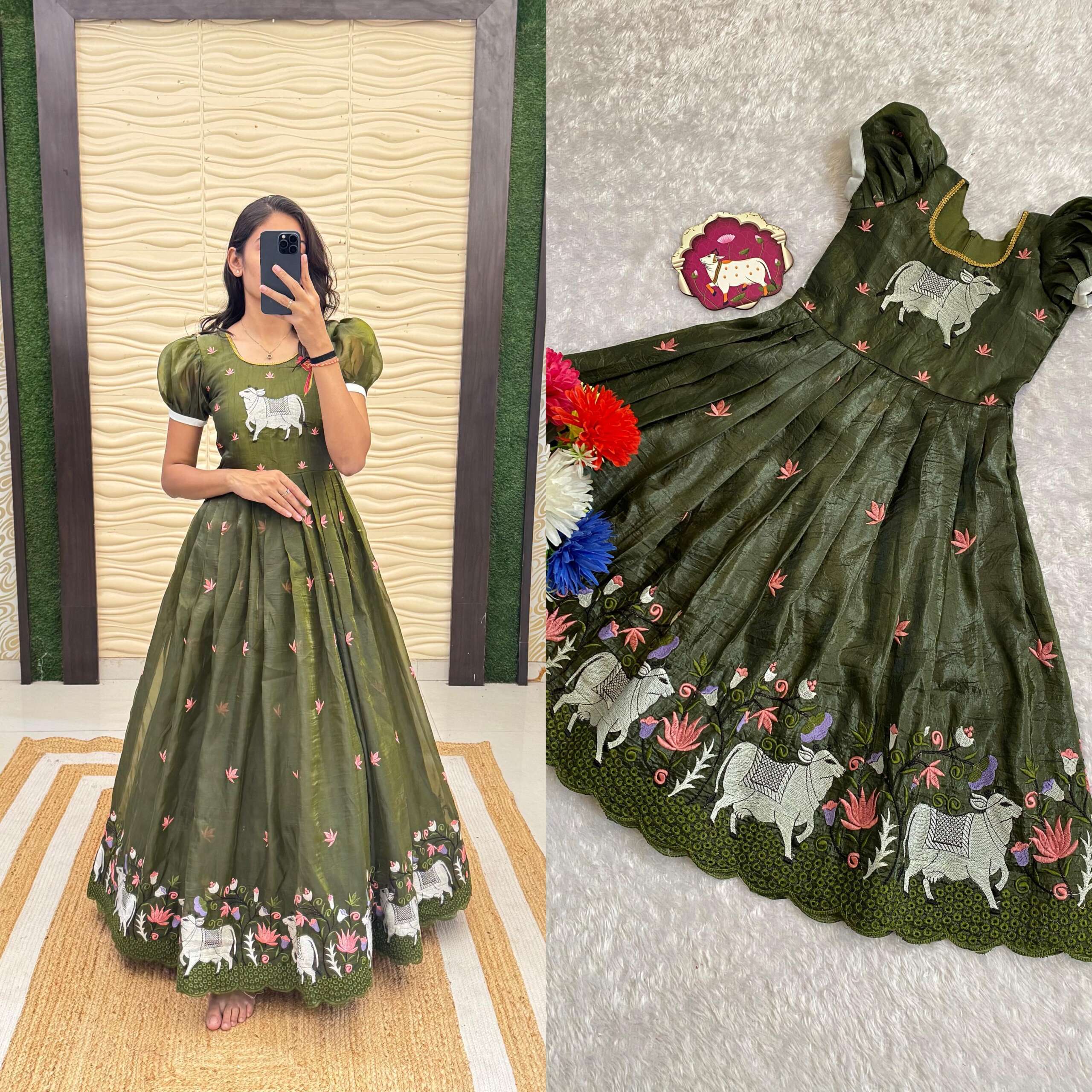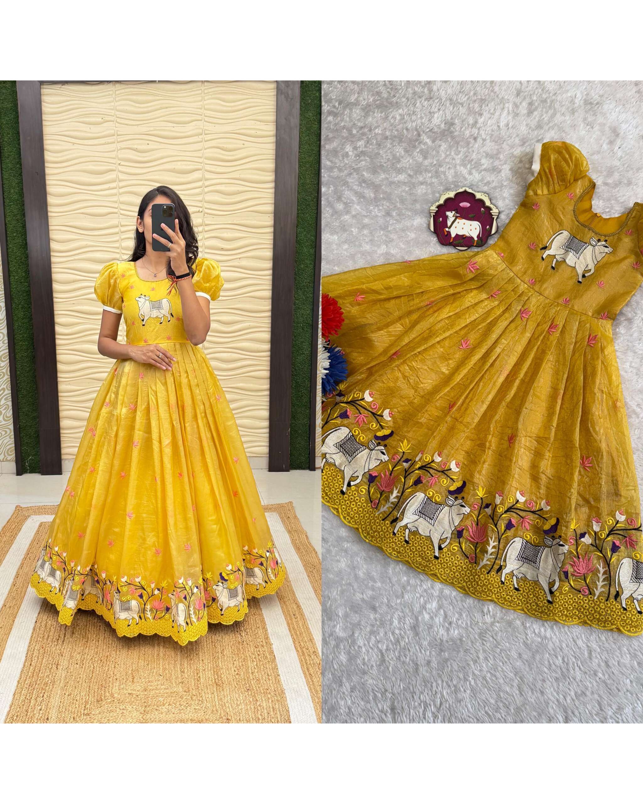 >Gown :- Gold crush fabric with bird embroidery work and Scalloped border