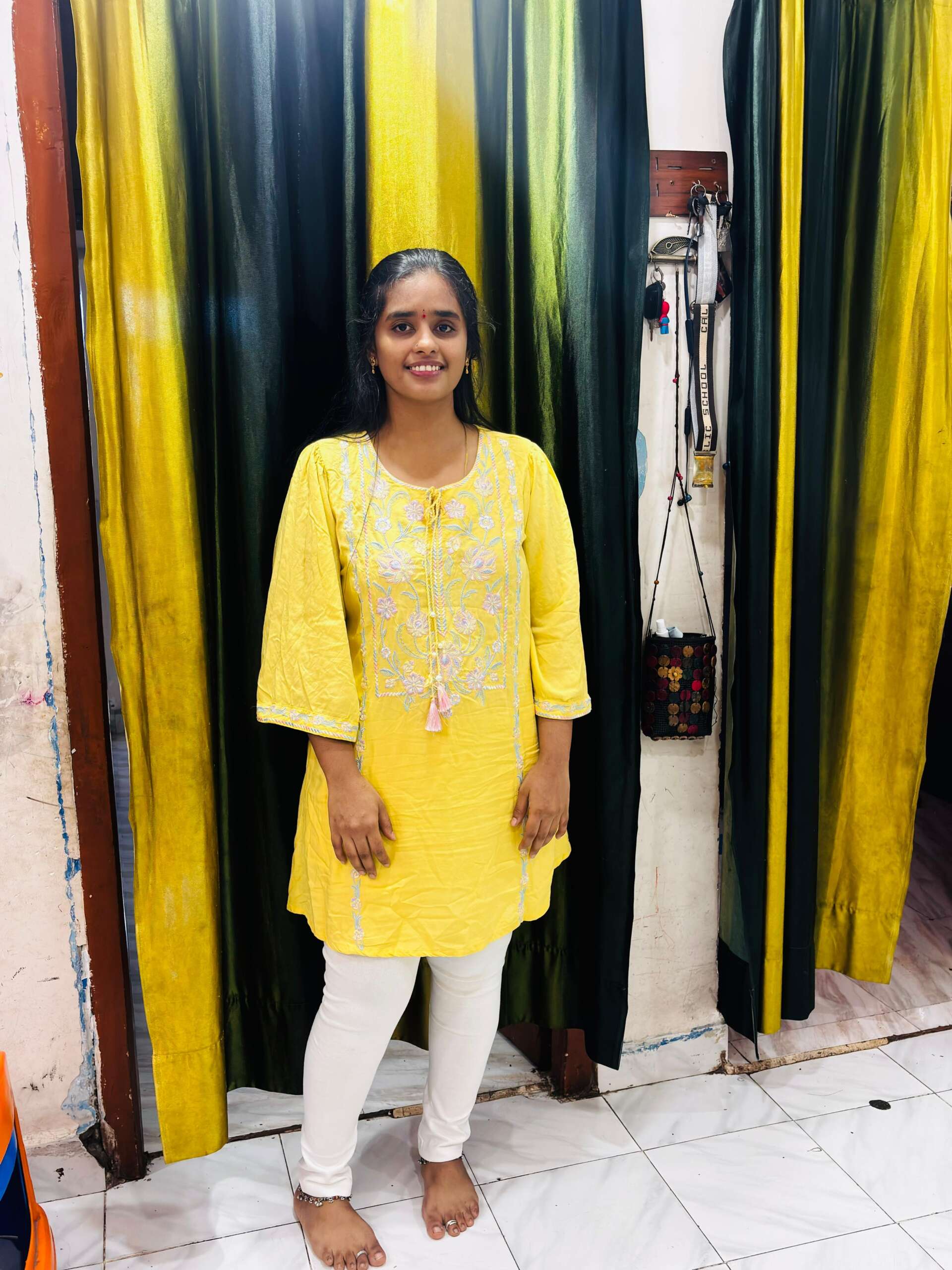 >Gown :- Gold crush fabric with bird embroidery work and Scalloped border