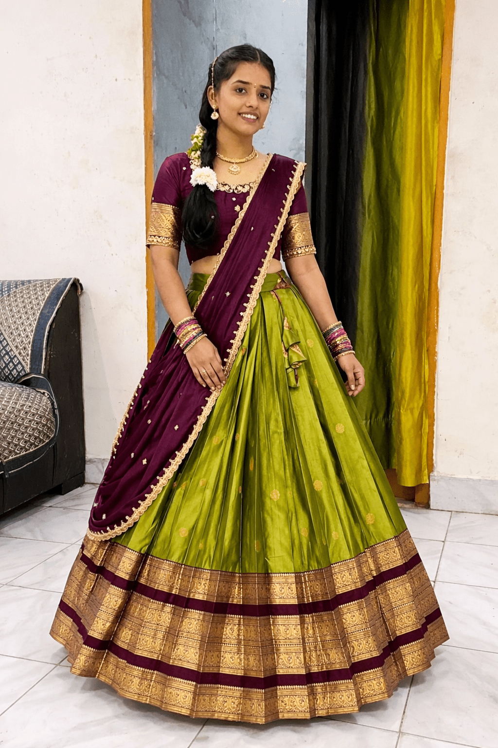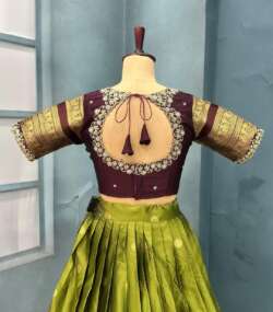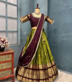 Lehanga Details:- Full stiched Kanjivaram silk With big jequard Border attached with Canvas patta zip and Latkan