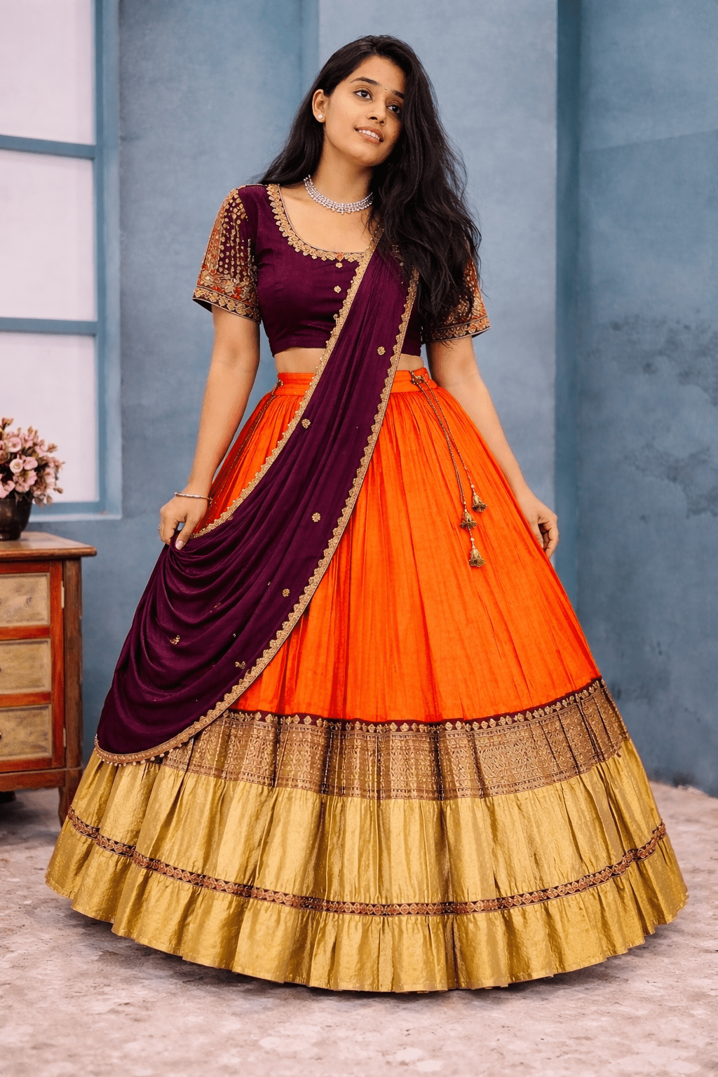 Lehenga – Heavy pure dola silk with print and weaving pattu border lehenga attached border belt and unique tassels